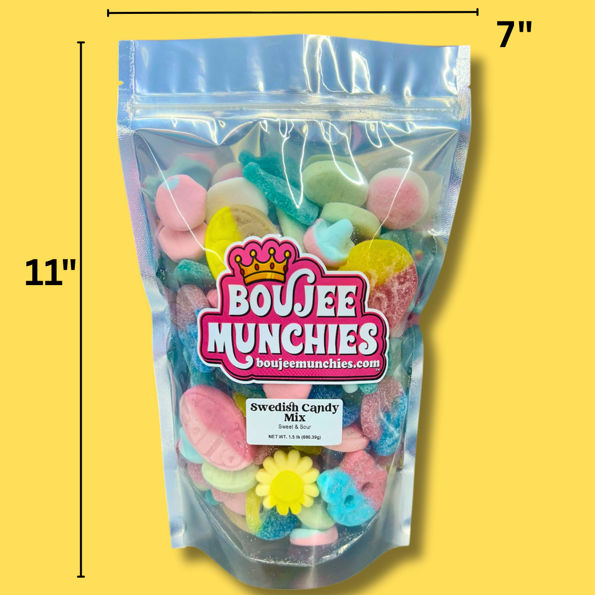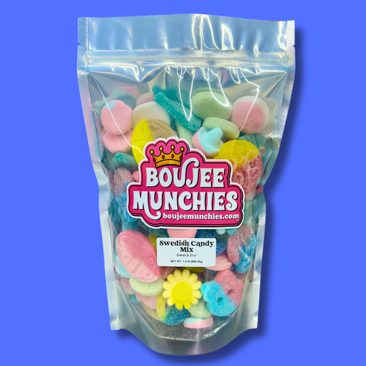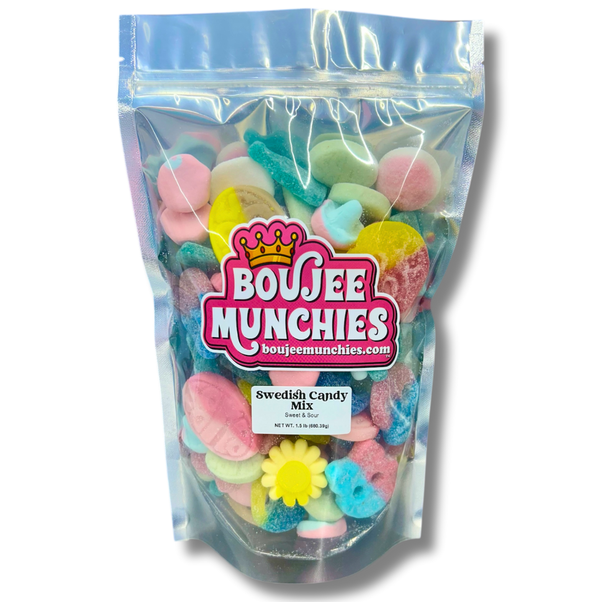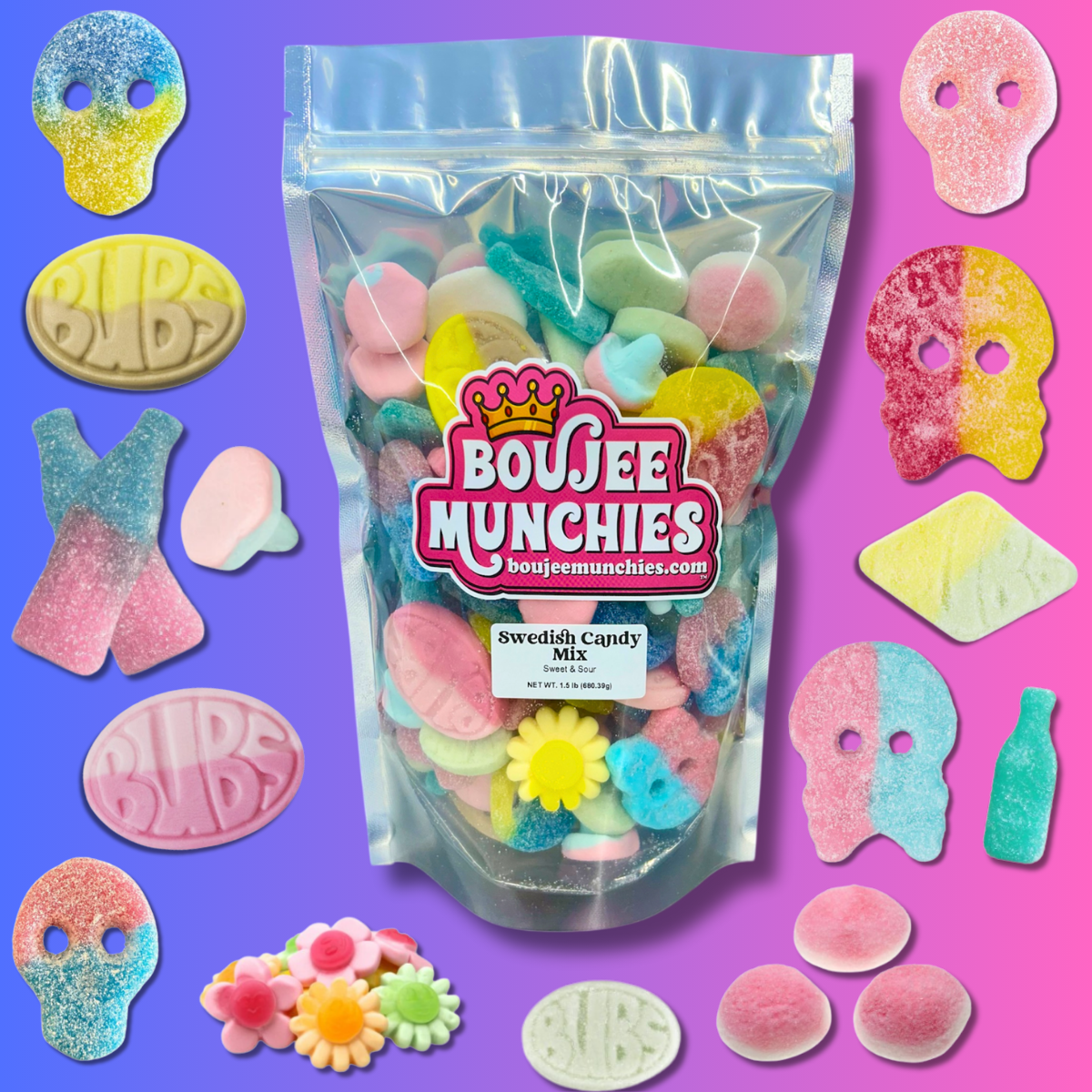 - Sweet and Sour Delight: Dive into the Boujee Munchies Swedish Candy Mix, a delightful gummy mix. Perfect for those craving a sweet and sour treat. Each bite offers a unique taste experience.